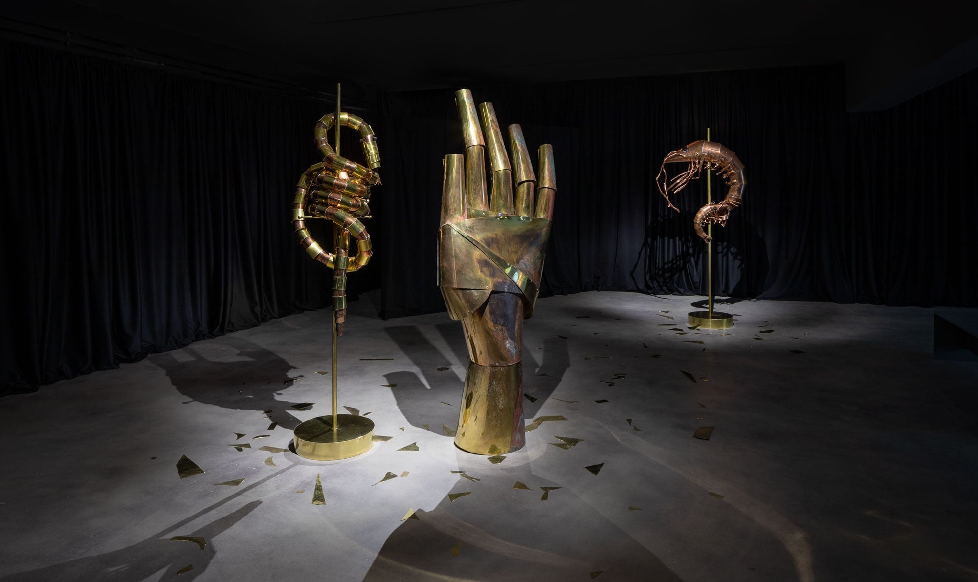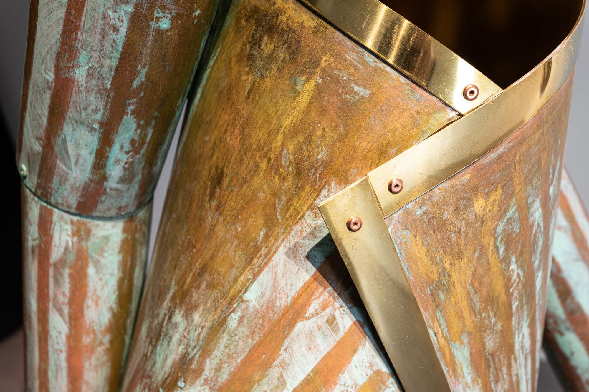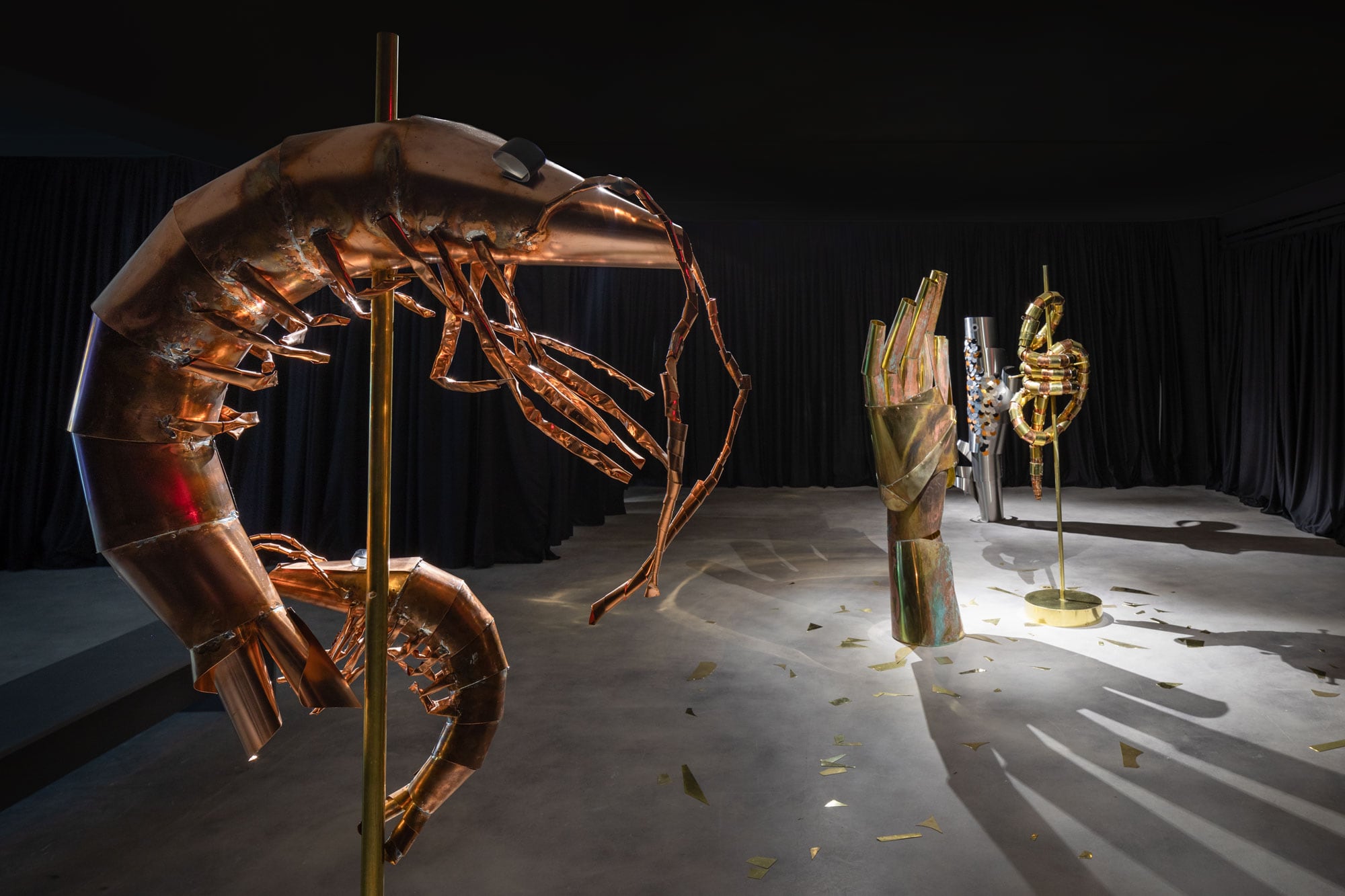 Caroline Mesquita is one of the most intriguing and innovative young sculptors to emerge out of France, and the Blaffer Art Museum is excited to present her first solo museum exhibition in the United States. Mesquita was born in 1989 in Brest, and she currently lives and works in Marseille. A jubilant disquiet presides over her sculptural work, which navigates the increasing intimacy between man and machine as our forms, materials, and desires frolic. Her combinatory practice marries the physicality of altered, oxidized, and painted copper and brass sheets with theatrical playfulness and socio-cultural reference. Mesquita’s ensuing experiments in metallurgy and materiality result in life-size figures interacting with one another in carnivalesque vignettes that slide between Hellenistic sculpture, baroque ballet, and melancholic parade. Even as she has more recently experimented with different chemical treatments to create a wider spectrum of color, as well as the medium of cut paper to interject lightness and fancy, she retains a distinctive boldness in her approach to space and the object—orchestrating immersive environments that pull us in, wittingly or not, to the questions being posed. In her continued exploration between majesty and monstrosity, earthly and the manmade, the Blaffer is thrilled to produce a newly commissioned, site-specific installation in 2021.