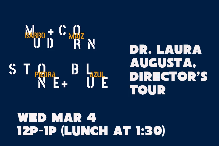 Join us for a tour and conversation with Dr. Laura Augusta for curatorial insights and a behind-the-scenes glimpse of bringing together the exhibition Mud + Corn + Stone + Blue, the culmination of more than a decade of research. Through the lens of artworks that tell vibrant personal stories, the tour will explore the entangled lands of the United States and Central America and the impacts of the industrial agricultural corn industry over time and place. The expansive exhibition is presented at both Blaffer Art Museum (through March 14) and Lawndale Art Center (February 28-May 2).